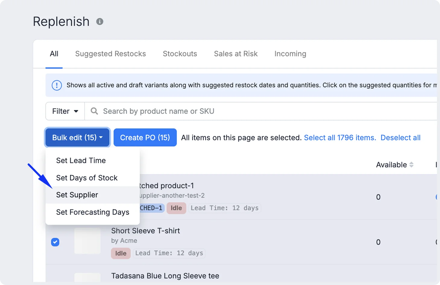 - 🔄 Bulk updates for efficiency: On the Replenish page, select multiple products, use the "Bulk Edit" tool, and apply a supplier to many products at once.
